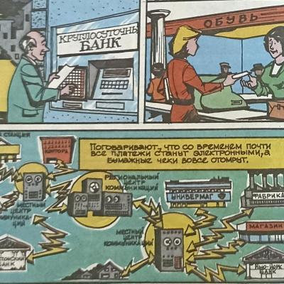 В начале 1990-х годов издательство «Начала-Пресс» выпустило русскую версию комиксов Федеральной резервной системы США, аналога нашего Центрального банка, о том, что такое деньги. Шестой выпуск был посвящён инструментам оплаты товаров и услуг без использования наличных денег — чекам и банковским картам. В западных экономиках такие инструменты массово распространялись с XIX века, а создание компьютеров, микрочипов и интернета привело к появлению привычных сегодня вещей и практик: банкомата, оплаты покупок банковской картой и т. д. В Европе и США банкоматы и карты для безналичной оплаты стали внедряться в повседневную жизнь в 1960–1970-е годы, в России — в эпоху перестройки. В 1988 году было подписано соглашение между советским бюро путешествий «Интурист» и международной организацией VISA International. В 1989 году Сбербанк СССР был принят в международную платежную систему VISA. Тогда в обращение были введены 144 банковские карточки, а в 1991 году появились первые банкоматы. Уже в конце 1990-х в России карточки стали стремительно распространяться, так что в 2000-е годы превратились в знакомый многим инструмент.