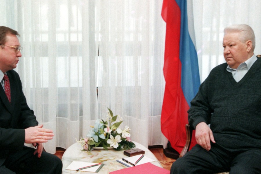 ТАС28. Россия, Москва. 23 марта. Первый и главный вопрос, который обсуждался сегодня на встрече Президента РФ Бориса Ельцина и министра внутренних дел Сергея Степашина - это обстановка на Северном Кавказе и меры по ее стабилизации, которые сейчас предпринимаются. Сергей Степашин доложил Президенту о ходе расследования террористического акта во Владикавказе, куда он вылетал по поручению Президента вместе с директором ФСБ Владимиром Путиным. Президент и министр подчеркнули необходимость не допустить роста напряженности в регионе, на что делали ставку террористы. Отмечено, что ход расследования и впредь будет находиться под личным контролем Президента. На снимке: Борис Ельцин и Сергей Степашин (слева) во время встречи . Фото Александра Чумичева и Александра Сенцова (ИТАР-ТАСС) 15.10