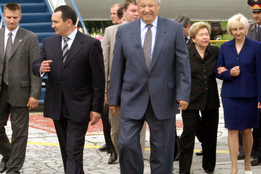 ТАС 37 Россия. Чувашская республика. Чебоксары. 6 июля. Первый президент Российской Федерации Борис Ельцин, президент Чувашской республики Николай Федоров, (на первом плане справа налево), супруга Бориса Ельцина Наина и супруга президента Чувашской республики Светлана, (на втором плане слева направо) на встрече в аэропорту Чебоксар. Фото ИТАР-ТАСС/ Олег Мальцев