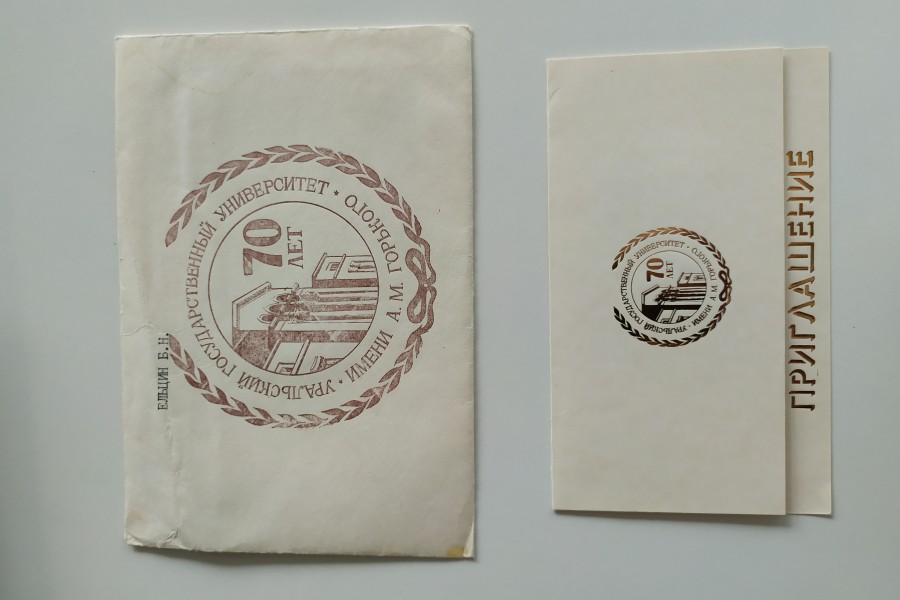 Пригласительный билет Уральского государственного университета им. А.М. Горького Б.Н. Ельцину для участия на торжественном собрании, посвященного 70-летию Уральского университета 18.10.1990 г. Дворец молодежи.
