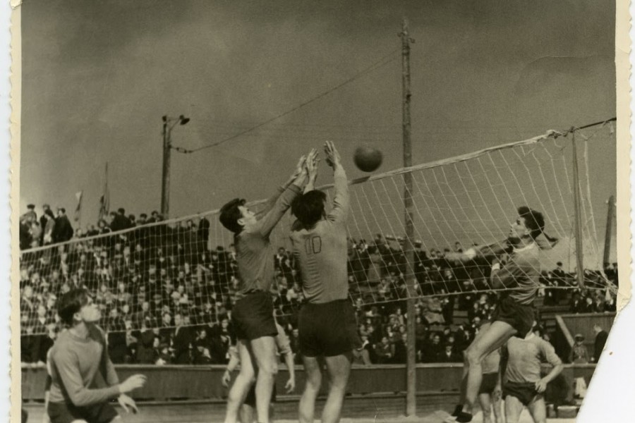 Б.Н. Ельцин (крайний справа) на соревнованиях по волейболу. Команда «Буревестник», сборная Уральского политехнического института им. С.М. Кирова (УПИ). 1950-е.