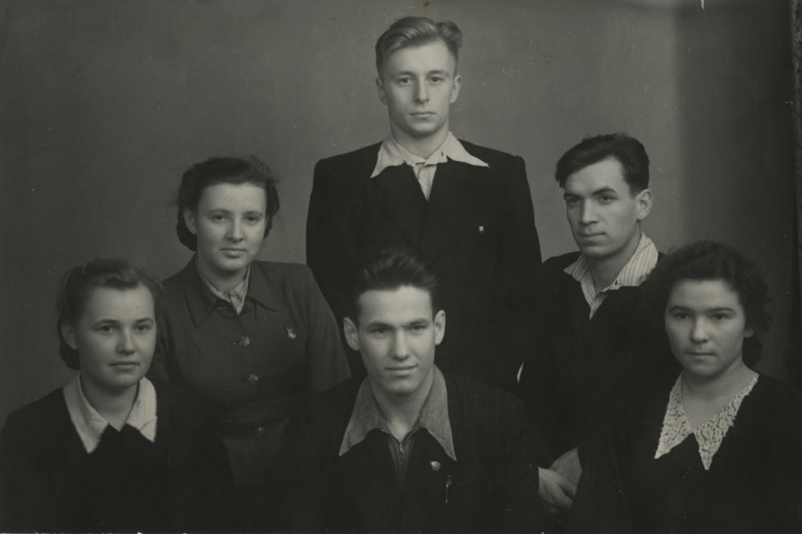 Студенческий «колхоз» «Шкодник» в день принятия устава. Свердловск. 22 ноября 1952 г. Слева направо: Л. Видинеева, М. Бацулова, Б. Ельцин, А. Лавочкин, В. Анисимов, Н. Гирина