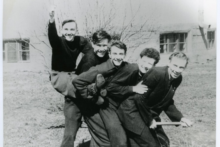 Члены сборной Уральского политехнического института им. С.М. Кирова (УПИ) по волейболу. Слева направо – Николай Глебов, Борис Ельцин, Александр Петров, Владимир Фельдман, Владлен Бусалаев [1954].