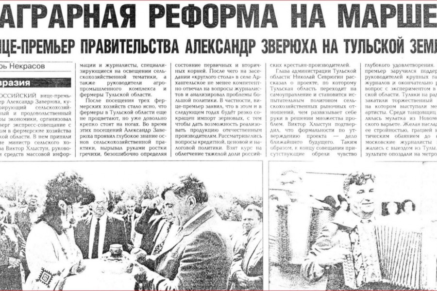 Скриншот "Независимой газеты" от 19 июня 1993 г., первая полоса. "Российский вице-премьер Александр Заверюха, курирующий сельскохозяйственный и продовольственный секторы экономики, организовал в четверг экспресс-совещание с выездом в фермерские хозяйства Тульской области"