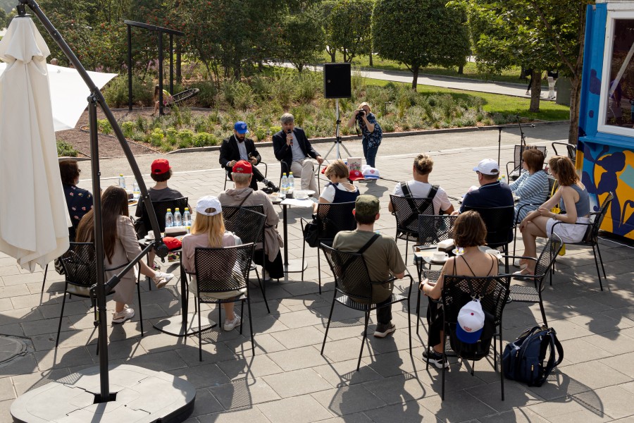 В летнем кафе у Сада трав 18 августа Программная дирекция Ельцин Центра провела традиционный пресс-завтрак для екатеринбургских СМИ, чтобы подробно рассказать о том, что подготовили для горожан в предстоящем сезоне. Директор Музея Бориса Ельцина Олег Лутохин и руководитель Программной дирекции Денис Корнеевский поделились с журналистами новостями Ельцин Центра, рассказали о грядущих премьерах и выставках, о новых образовательных форматах и юбилейных датах.