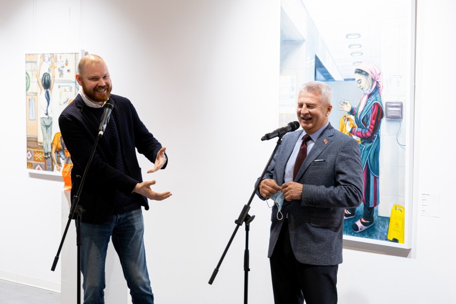 В фойе кино-конференц-зала Ельцин Центра 18 ноября открылась персональная выставка Натальи Гончаровой «Оранжевый шум», посвящённая проблеме отношения общества к трудовым мигрантам из Средней Азии.