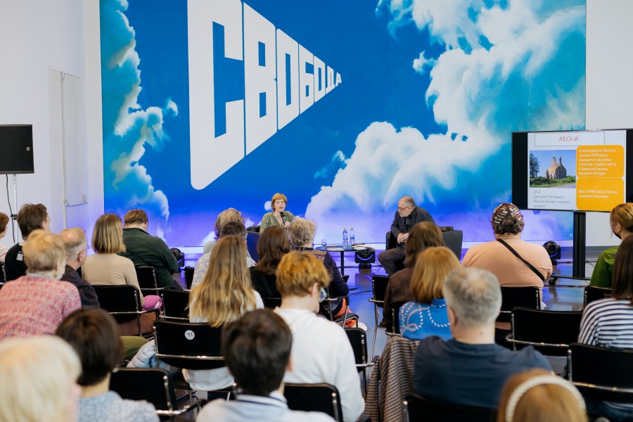 В рамках ежегодной акции «Библионочь» в зале Свободы 28 мая состоялась очередная встреча из авторского цикла Бориса Минаева «Два города». На этот раз гостем Ельцин Центра стала москвичка, писательница Майя Кучерская. Она — лауреат премии «Большая книга» и других литературных премий, автор книг «Современный патерик», «Бог дождя», «Тетя Мотя». Кроме того, она биограф и исследователь творчества Николая Лескова. Её последняя книга, выпущенная в прошлом году, о нём — «Прозёванный гений» из серии ЖЗЛ.