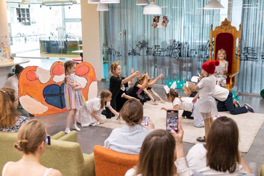 За первый летний месяц в Ельцин Центре незаметно пролетели четыре смены детских городских лагерей, организованные «Детским центром 18–». Одна из смен была посвящена театру. Она так и называлась «Мир — театр». Участие в ней приняли младшие школьники и дошколята (были охвачены дети от 6 до 10 лет). В день завершения смены, 30 июня, ребята показали родителям спектакль, к которому сами написали сценарий, придумали декорации, костюмы, выбрали музыкальное сопровождение и сами же осуществили постановку под руководством театрального педагога.
