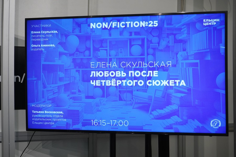 Елена Скульская 3 декабря представила на книжной ярмарке Нонфикшен свою новую книгу «Любовь после четвёртого сюжета». Автора и её новую книгу представила Татьяна Восковская, руководитель издательских проектов Ельцин Центра, а ведущей выступила известный издатель, одна из самых профессиональных редакторов Ольга Аминова.