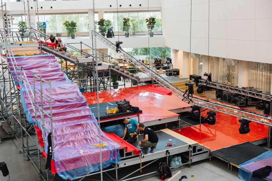 Монтаж подиума в Атриуме Ельцин Центра. Международная неделя моды UF LAB