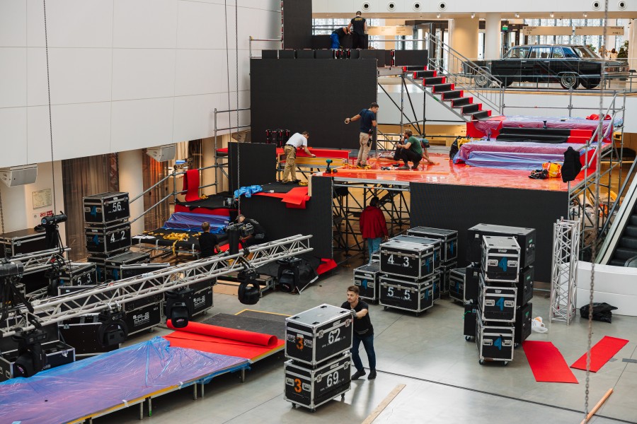 Монтаж подиума в Атриуме Ельцин Центра. Международная неделя моды UF LAB