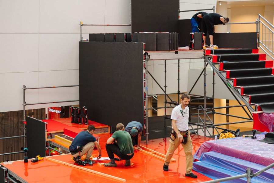 Монтаж подиума в Атриуме Ельцин Центра. Международная неделя моды UF LAB