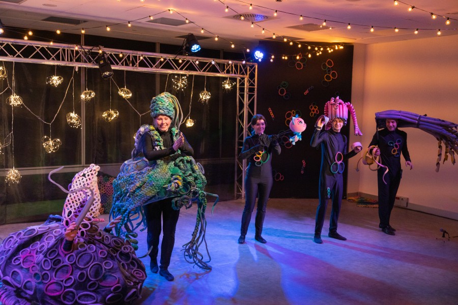 Театральная платформа «В Центре» 20 декабря представила детям и родителям новогодний спектакль «Про китёнка и котёнка» – вполне современную историю о том, как важно иметь друзей и быть кому-то нужным в этом большом мире. Сказочную историю об одном очень чувствительном китёнке, который постоянно на всех обижался, пока не обрёл друзей, придумал драматург Сергей Ермолин. Поставил спектакль и сыграл одного из героев режиссёр Александр Вахов. Удивительные космические костюмы сочных флуоресцентных цветов, достойные модных подиумов, придумали и воплотили в жизнь Сергей Ермолин и Светлана Баженова (драматург, режиссёр, лауреат конкурса пьес о 90-х «Зачем я это помню»).