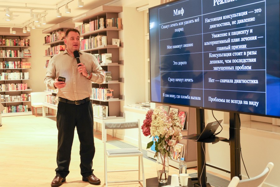 В Филиале Ельцин Центра в Москве, в усадьба Долгоруковых-Бобринских 18 сентября прошла пятая лекция медицинского цикла «Мне просто спросить», на которых гости имеют возможность пообщаться с лучшими московскими врачами доказательной медицины. О современной стоматологии говорил специалист с двадцатилетним стажем, врач высшей категории, стоматолог-хирург, имплантолог, стоматолог-ортопед Иосиф Черняк.