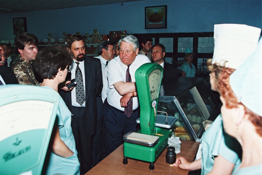 Россия, Благовещенск. 14-16 июня 1994 г. Губернатор Амурской области Владимир Полеванов и президент РФ Борис Ельцин во время посещения продовольственного магазина № 61. Фото Дмитрий Соколов