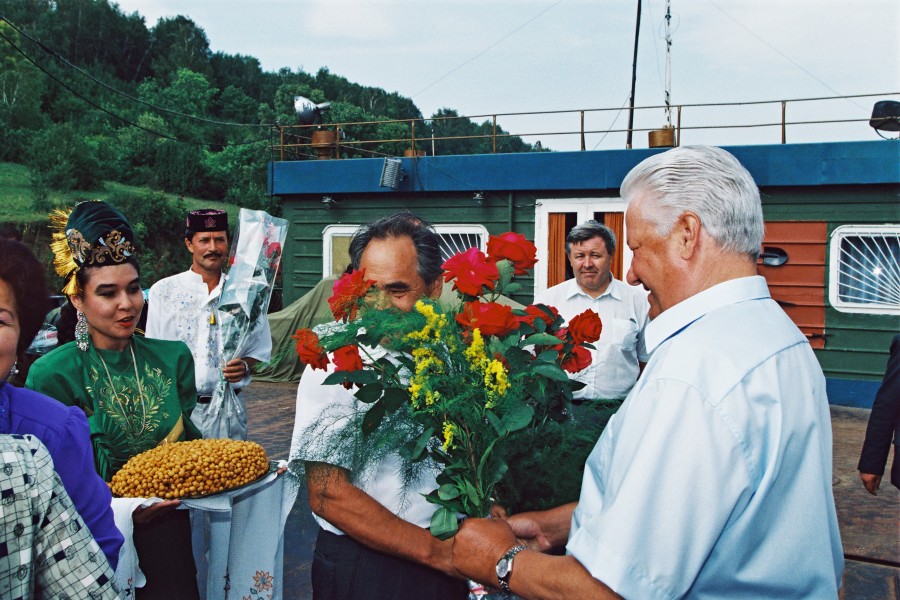 Татарстан. Круиз по р. Волге, теплоход "Россия". 11-30 августа 1994 г. Президент Татарстана Минтимер Шаймиев и президент РФ Борис Ельцин. В ходе поездки были посещены г. Плес Ивановской области, г. Нижний Новгород, г. Тольятти, г. Волжск (показательные полеты военной авиации), г. Ростов-на-Дону и г. Сочи резиденция "Бочаров ручей". Фото Дмитрий Соколов