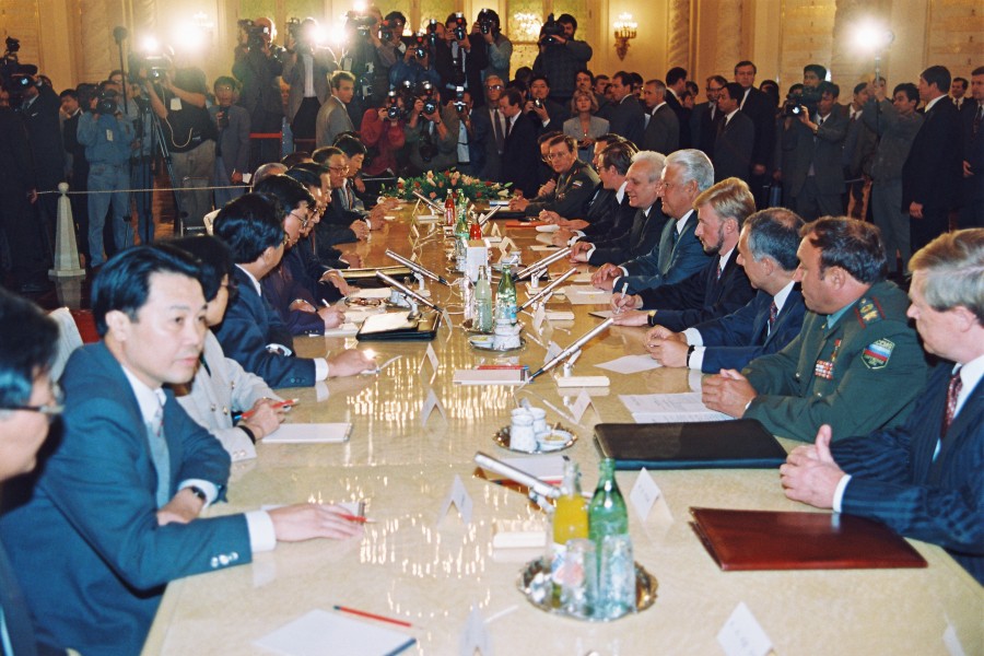 Россия. Москва. 2-3 сентября 1994 г. Председатель Китайской Народной Республики Цзян Цзэминь и президент РФ Борис Ельцин. Среди присутствующих министр иностранных дел РФ Андрей Козырев. Фото Дмитрий Соколов
