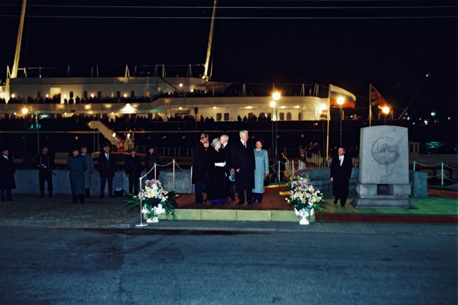Россия. Санкт-Петербург. 20 октября 1994 г. Супруг королевы Англии принц Филипп, королева Англии Елизавета II, президент РФ Борис Ельцин и супруга президента РФ Наина Ельцина перед официальным обедом на борту яхты «Британия». Фото Дмитрий Соколов
