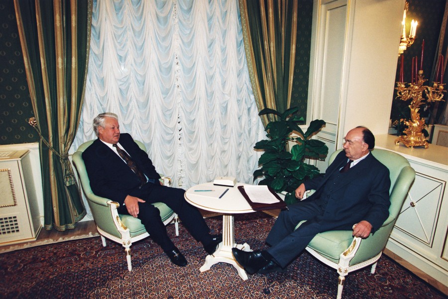 Россия. Москва. 9 ноября 1994 г. Президент РФ Борис Ельцин и директор Федеральной службы РФ по телевидению и радиовещанию и Государственной телерадиокомпании "Останкино" Александр Яковлев. Фото Дмитрий Соколов