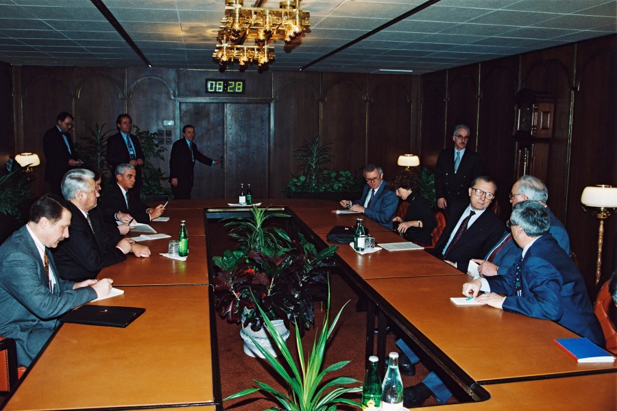 Венгиря. Будапешт. 5 декабря 1994 г. Президент РФ Борис Ельцин и премьер-министр Канады Жан Кретьен. Среди присутствующих руководитель Службы протокола Администрации Президента РФ Владимир Шевченко. Фото Дмитрий Соколов