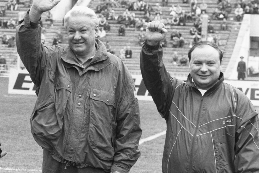 Москва. На Большой спортивной арене Лужников состоялся футбольный матч между сборными командами правительств России и Москвы. На снимке: главный тренер сборной России Борис Ельцин и начальник сборной России Егор Гайдар. Фото Игоря Уткина /ИТАР-ТАСС/