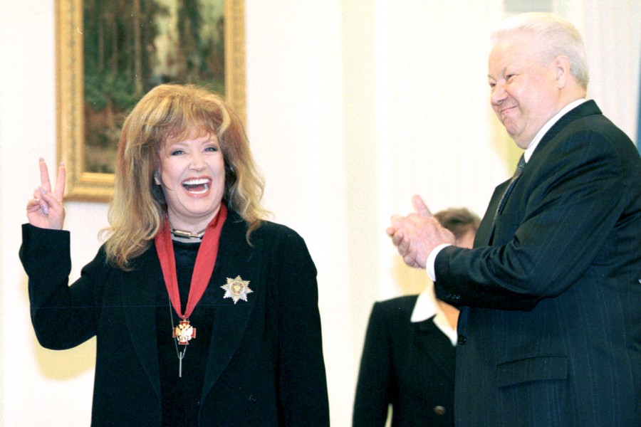 Россия, Москва. 15 апреля. В Кремле президент РФ Борис Ельцин поздравил звезду российской эстрады Аллу Пугачеву с юбилеем и наградил ее орденом "За заслуги перед Отечеством" II степени. на снимке: после вручения награды. Фото Александра Чумичева и Александра Сенцова (ИТАР-ТАСС)
