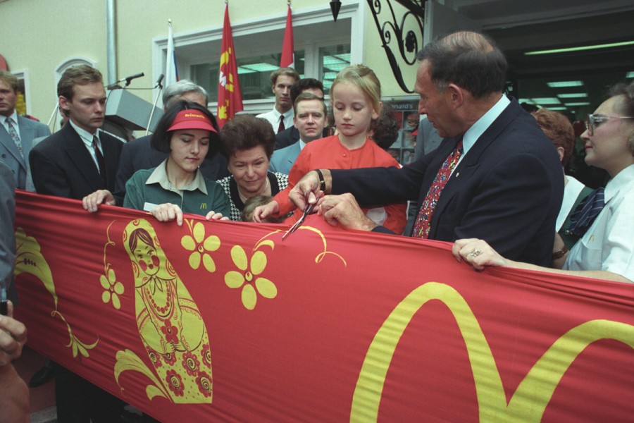 Наина Ельцина на открытии ресторана "Макдоналдс" на Старом Арбате в Москве (1993)