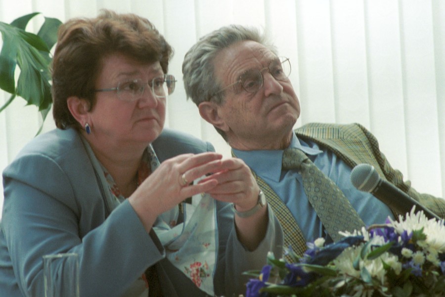 Описание: Россия, Московская область. В Россию с рабочим визитом прибыл основатель сети благотворительных фондов Джордж Сорос. Он посетил Ярославль и Красноармейск, где состоялось обсуждение действующих программ и были объявлены новые инициативы Института "Открытое общество". На снимке: во время встречи Джорджа Сороса ( справа) с главами городов России, участниками проекта "Стратегии развития малых городов". Слева - президент института "Открытое общество (Фонд Сороса) Екатерина Гениева. Фото Валентина Кузьмина (ИТАР-ТАСС)