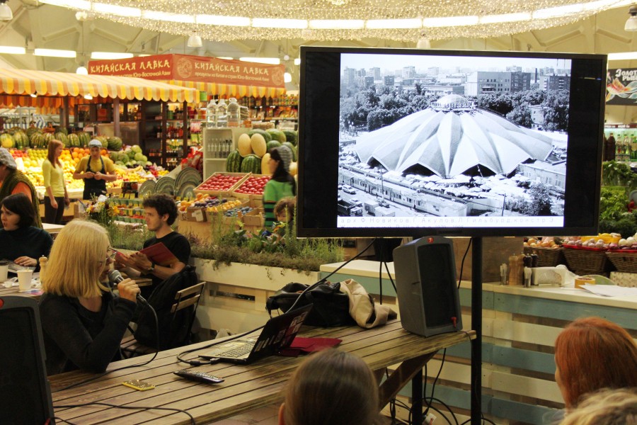 Анна Броновицкая (кандидат искусствоведения, специалист по истории архитектуры XX века, директор по исследованиям Института модернизма) читает лекцию на тему «Модернизм на Тульской: рынок, дом-корабль и другие проекты» - в рамках фестиваля «Книжный рынок» на Даниловском рынке, который прошел в Москве 5-6 сентября 2015 г.