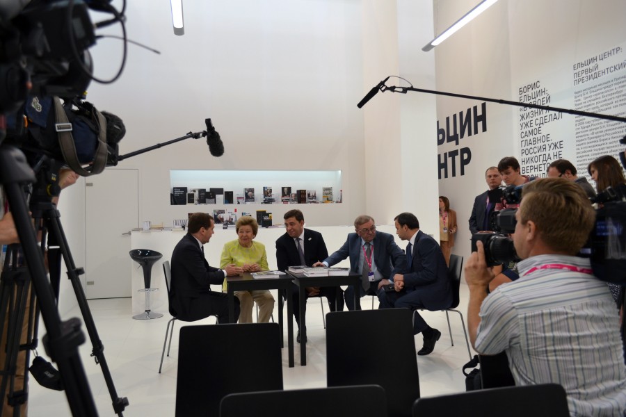 ИННОПРОМ 2014. Проходящую в Екатеринбурге юбилейную – пятую – международную промышленную выставку ИННОПРОМ, на которой представлен и Центр Б.Н. Ельцина, посетил премьер-министр России Дмитрий Медведев. Экспозиция Ельцин центра стала одним из пунктов выставочной «обязательной программы» премьера. Дмитрий Анатольевич встретился с супругой первого Президента России Наиной Иосифовной Ельциной и подробно ознакомился с экспозицией.