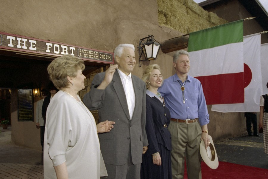 Пребывание президента РФ Бориса Ельцина на встрече глав государств и правительств стран «восьмерки». Президент РФ Бориса Ельцин и супруга президента РФ Наина Ельцина во время обеда с участием глав государств и правительств стран «восьмерки» с супругами в