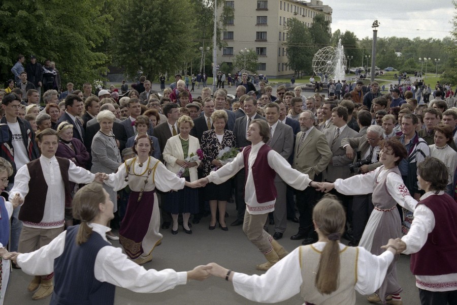 Президент РФ Борис Ельцин на отдыхе. Пребывание в Карелии президента Финляндии Мартти Ахтисаари. Супруга президента РФ Наина Ельцина и супруга президента Финляндии Ээва Ахтисаари во время встречи с жителями г. Петрозаводска