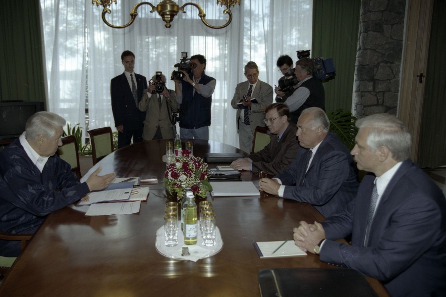 Президент РФ Борис Ельцин на отдыхе. Встреча с директором Федеральной пограничной службы РФ А.И. Николаевым, премьер-министром РФ В.С. Черномырдиным, председателем Государственного таможенного комитета РФ А.С. Кругловым