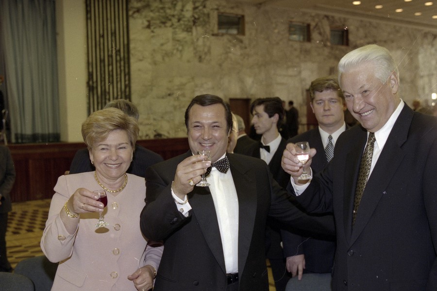 Торжественный обед, посвященный празднованию юбилея 850-летия г. Москвы. Наина Ельцина и Борис Ельцин с итальянским певцом Робертино Лоретти