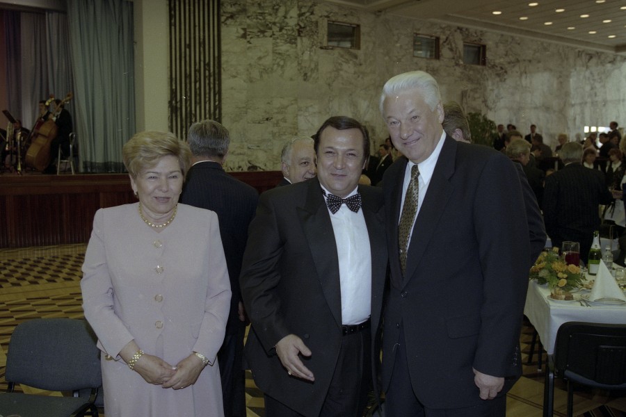 Торжественный обед, посвященный празднованию юбилея 850-летия г. Москвы. Наина Ельцина и Борис Ельцин с итальянским певцом Робертино Лоретти
