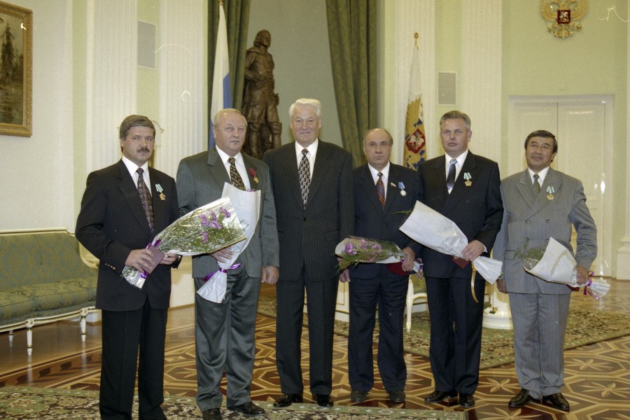 Вручение Государственных наград РФ руководителям субъектов РФ. После вручения наград: губернатор Ямало-Ненецкого АО Ю.В. Неелов, губернатор Свердловской области Э.Э. Россель, президент РФ Борис Ельцин, глава администрации Ульяновской области Ю.Ф. Горячев,