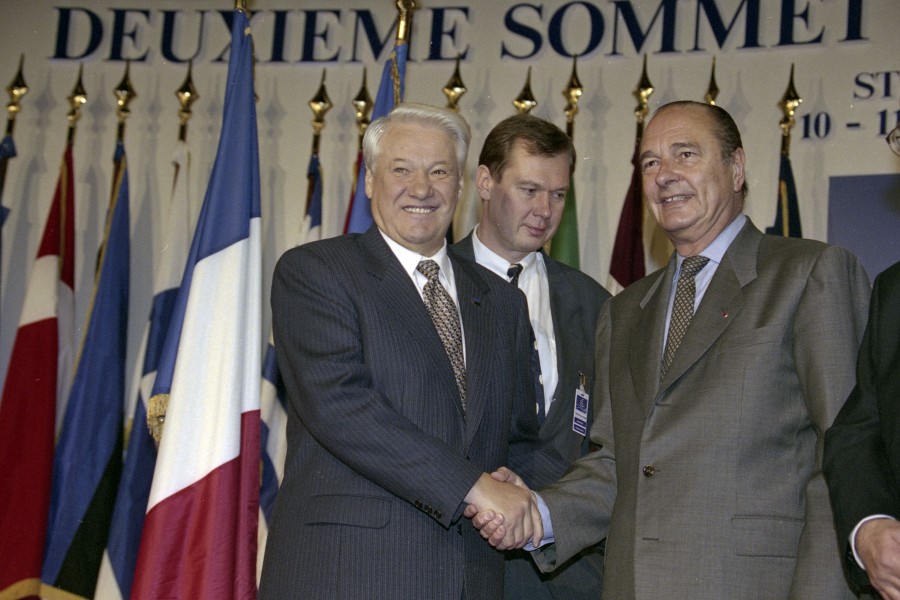 Пребывание президента РФ Бориса Ельцина в г. Страсбурге. Президент РФ Борис Ельцин и президент Франции Жак Ширак во время встречи с журналистами