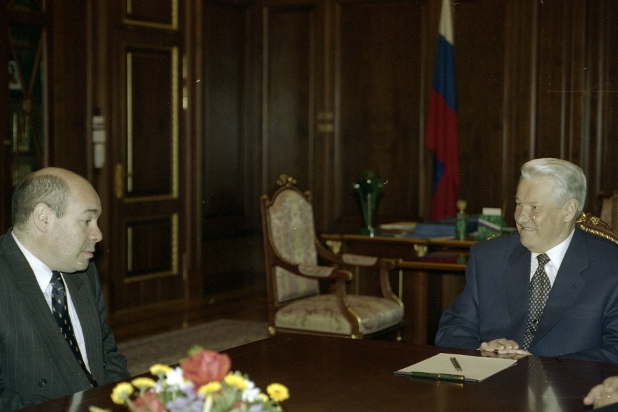 Президент РФ Борис Ельцин во время встречи с председателем ВГТРК Н.К. Сванидзе и главным редактором общероссийского государственного телеканала «Культура» М.Е. Швыдким