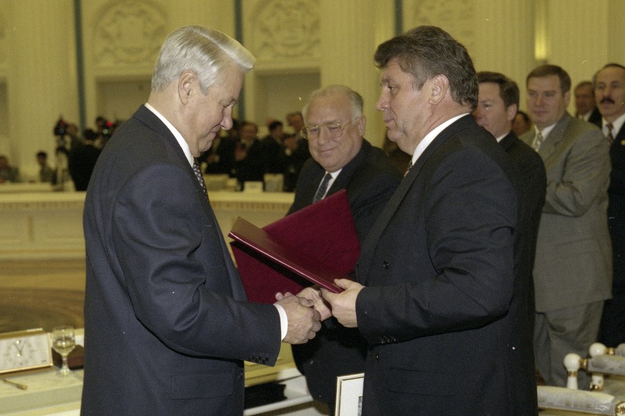 Церемония подписания договоров о разграничении предметов ведения и полномочий между органами государственной власти РФ и органами государственной власти Архангельской, Кировской, Мурманской, Ульяновской и Ярославской областей. Президент РФ Борис Ельцин и