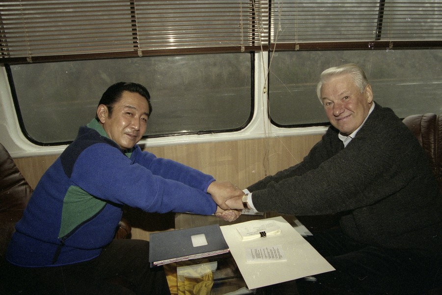 Пребывание президента РФ Бориса Ельцина в Красноярске. Президент РФ Борис Ельцин и премьер-министр Японии Рютаро Хасимото на катере во время прогулки по Енисею