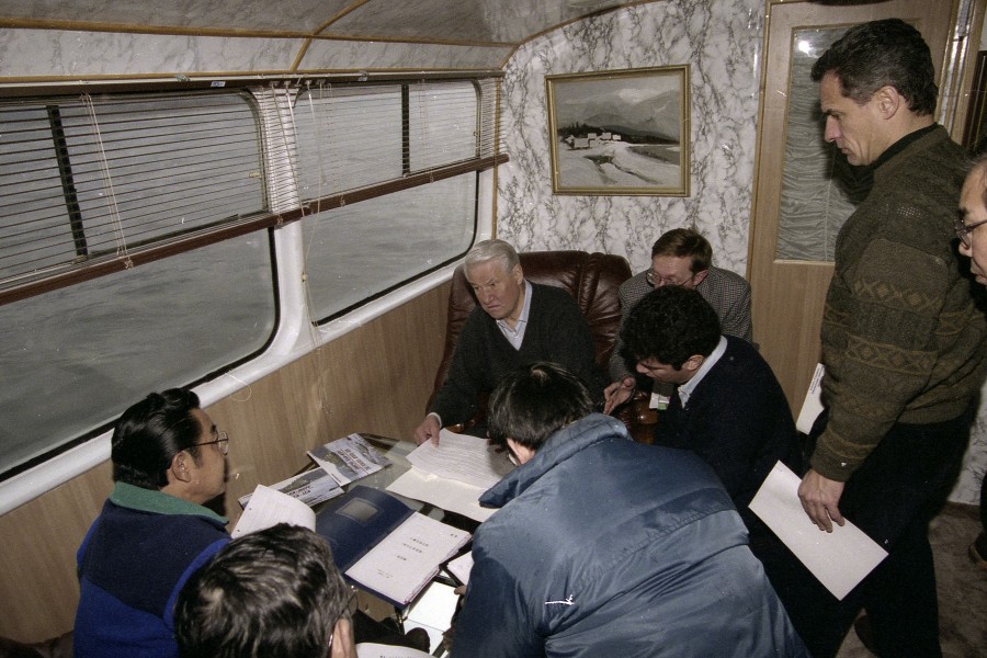 Пребывание президента РФ Бориса Ельцина в Красноярске. Президент РФ Борис Ельцин и премьер-министр Японии Рютаро Хасимото на катере во время прогулки по Енисею