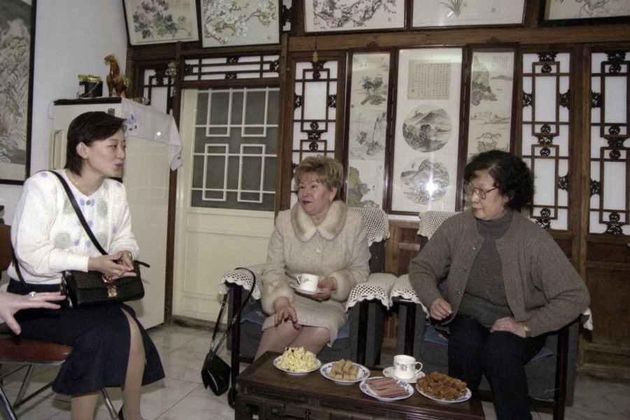 Государственный визит президента РФ Бориса Ельцина в Китайскую Народную Республику. Супруга президента РФ Наина Ельцина во время посещения семьи китайского художника