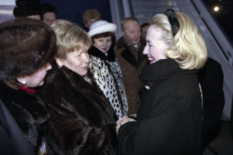 Встреча супруги президента РФ Наины Ельциной с супругой президента США Хиллари Клинтов в г. Екатеринбурге. Во время встречи в аэропорту