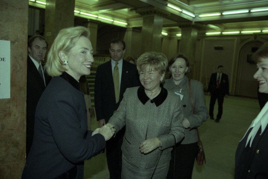 Встреча супруги президента РФ Наины Ельциной с супругой президента США Хиллари Клинтов в г. Екатеринбурге. Во время посещения Уральского государственного технического университета и встречи с представительницами Уральской ассоциации женщин и других неправ