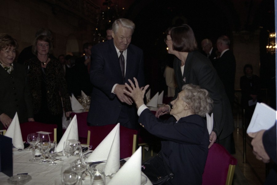 Государственный визит президента РФ Бориса Ельцина в Королевство Швеция. Во время встречи со шведской писательницей Астрид Линдгрен на завтраке от имени Правительства Швеции