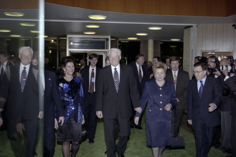 Государственный визит президента РФ Бориса Ельцина в Королевство Швеция. Официальный обед в честь Их Величеств Короля Швеции и Королевы Сильвии от имени президента РФ Бориса Ельцина и супруги президента РФ Наины Ельциной в Посольстве РФ