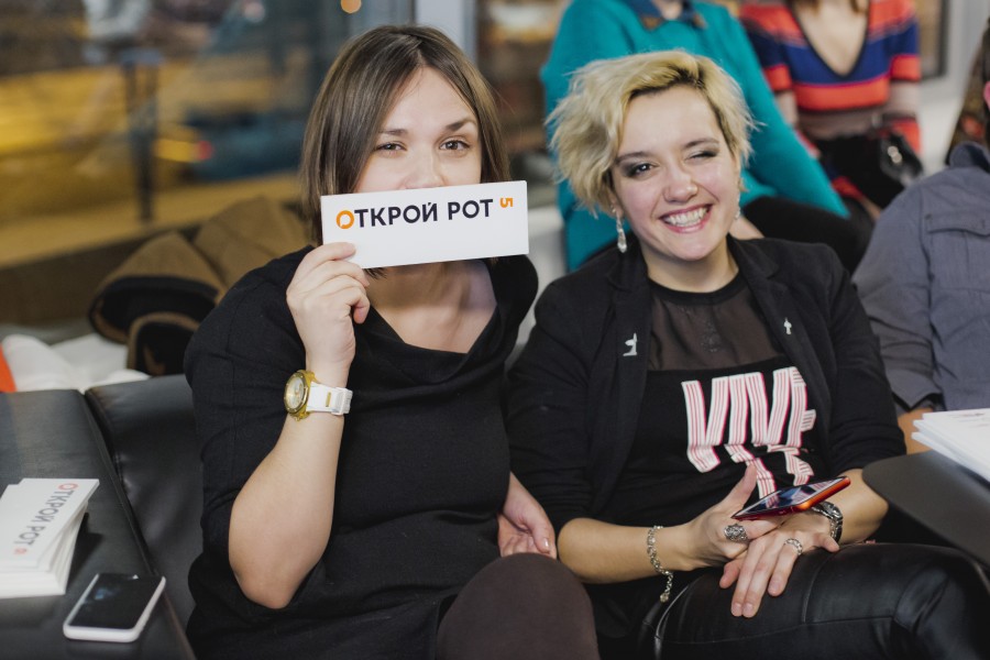 Анна Осокина и Катерина Швалюк, члены жюри чемпионата России по чтению вслух «Открой рот» в Ельцин Центре в Екатеринбурге. Фото Любови Кабалиновой.