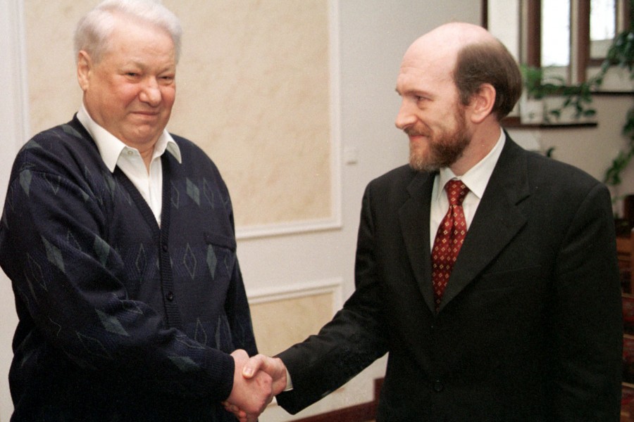 Описание: Москва. Президент РФ Борис Ельцин (слева) и глава администрации Президента РФ Александр Волошин. Фото Александра Сенцова и Александра Чумичева /ИТАР-ТАСС/