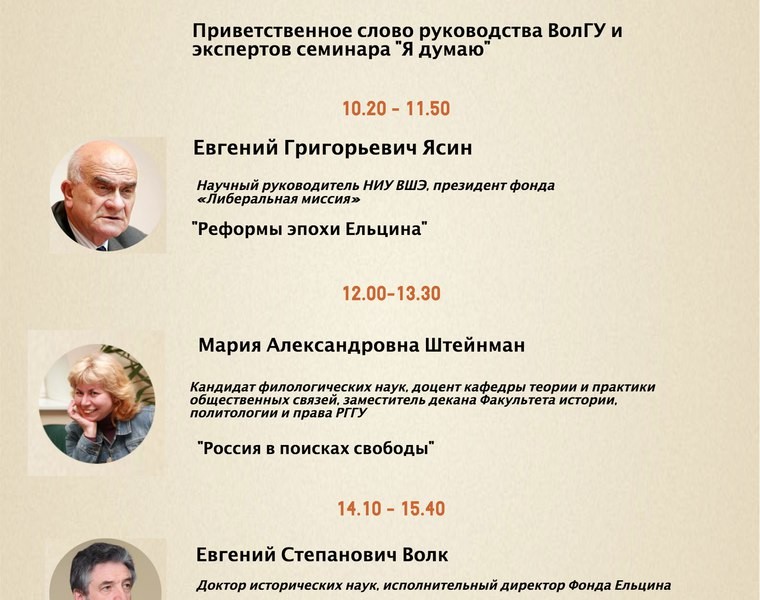 Программа молодежного ельцинского семинара «Я думаю!» в Волгограде. Волгоградский госуниверситет 18 марта впервые принимал молодежный ельцинский семинар «Я думаю!». Этот проект реализуется Ельцин центром совместно в Фондом «Либеральная миссия». Фото Анастасии Обуденковой.
