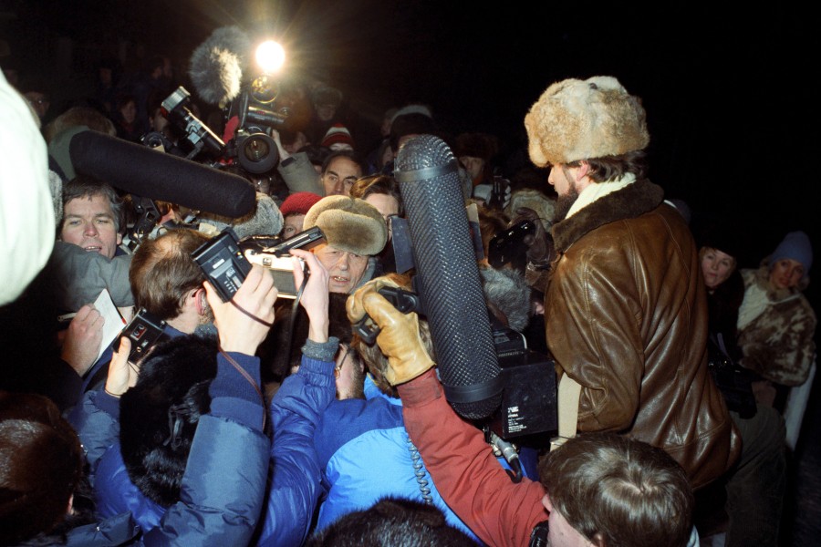 Moscow. On the 23rd of December 1986 academician Andrei Sakharov returned from the exile. Photo TASS / Valentin Kuzmin; Valentin Sobolev Москва. 23 декабря 1986 года из семилетней горьковской ссылки вернулся академик Андрей Сахаров. Во время встречи на Ярославском вокзале столицы. Фото Валентина Кузьмина и Валентина Cоболева /Фотохроника ТАСС/